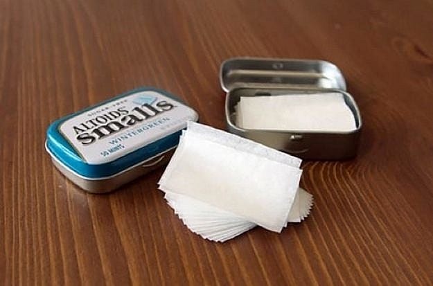 Forget buying those costly face oil blotting cloths. Cut up some coffee filters and put them in an old Altoids tin. Then, toss them in your purse!
