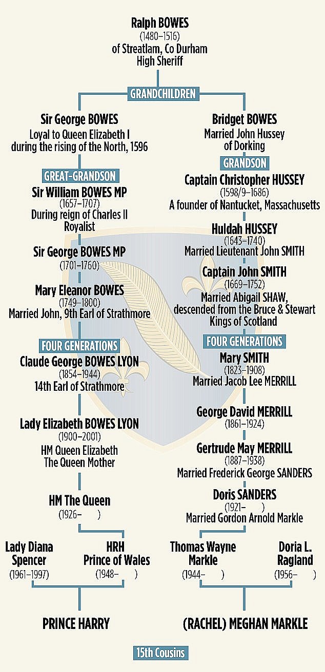 Meghan is descended from Ralph Bowes through her father. Bridget Bowes married John Hussey. Their grandson Christopher Hussey went to the New World in 1632 and helped found Nantucket, Massachusetts. Centuries later, one of his descendants is Doris Sanders, who is Meghan’s paternal grandmother.
