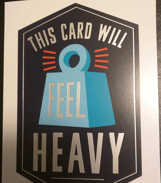 “This Card Will Feel Heavy,” the card says on front, which normally indicates there is some kind of gift insisde.