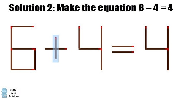 The second solution is to move the vertical matchstick from the “+” sign and add it to the number “6” to make it an “8.” As a result, you now get “8-4 =4.”