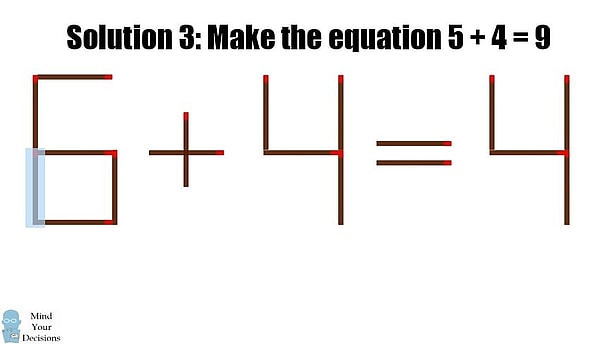 The third solution is somewhat controversial, but it still is correct. Take the bottom-left vertical matchstick from the number “6” and add it to the top of the far right number “4” to make it become a “9.” Then, you get “5+4=9.” The controversy here is that many people don’t believe that this is a proper “9” but others say there is no set rule on what a “9” should look like, and therefore, the solution is fine!
