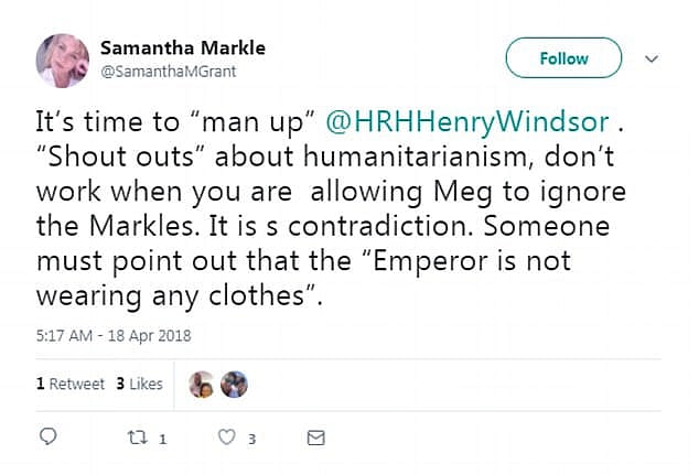 “It’s time to ‘man up’ @HRHHenryWindsor. ‘Shout outs’ about humanitarianism, don’t work when you are allowing Meg to ignore the Markles. It is s (sic) contradiction,” Grant wrote on Twitter. “Someone must point out that the ‘Emperor is not wearing any clothes.'”