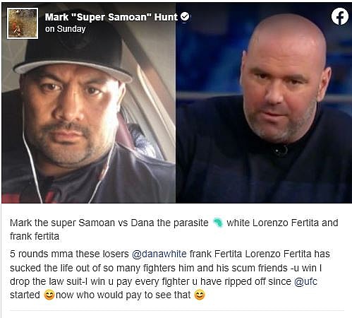 “Mark the super Samoan vs Dana the parasite white Lorenzo Fertita and frank fertita,” Hunt posted on Instagram. “5 rounds mma these losers @danawhite frank Fertita Lorenzo Fertita have sucked the life out of so many fighters him and his scum friends.