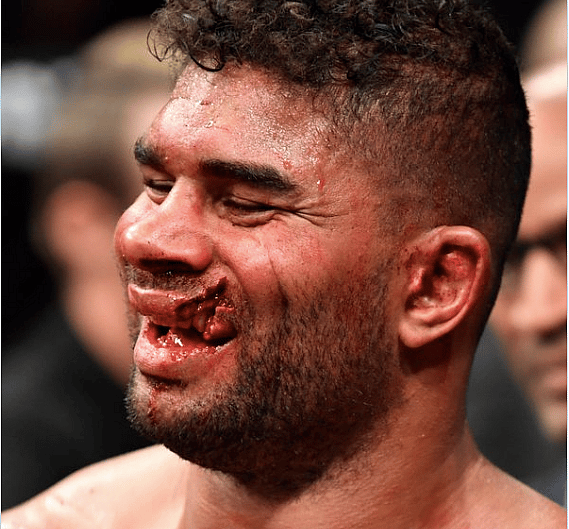 If you didn’t see the fight, Overeem wasn’t exactly cruising through Rozenstruik, but he did control much of the fight with his clinch work and top game. Just when it appeared he was doing to leave DC with the victory, Rozenstruik sent him to the deck with a couple of vicious shots. As you can see below, Overeem’s lip was blown up by one of the strikes as well.