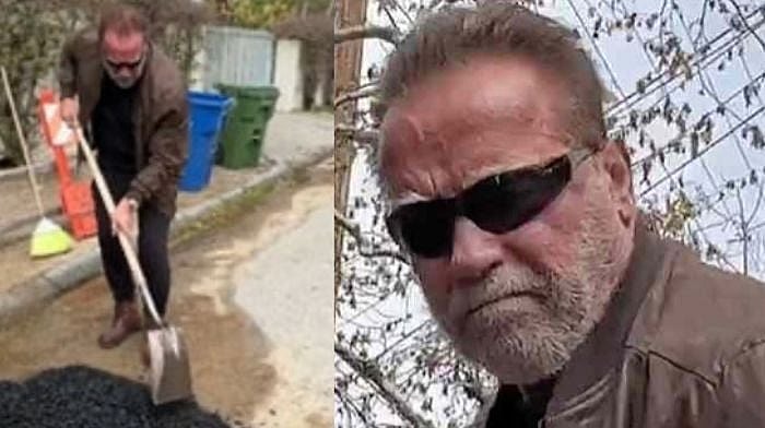 It all started on Tuesday, when Schwarzenegger took to Twitter to post a video of himself filling what he described as a “pothole” in his neighborhood.