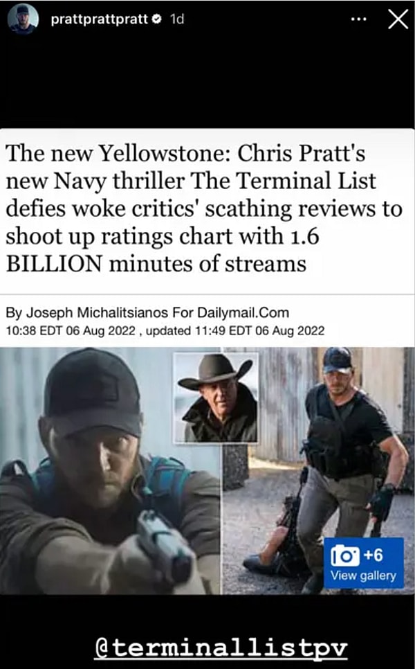 Daily Mail reported that despite being panned by woke critics, “The Terminal List” skyrocketed to No. 2 on the list of America’s most-streamed shows last week. According to Fox News, Pratt took to his Instagram Story to celebrate his victory over “woke” critics, sharing this screenshot:
